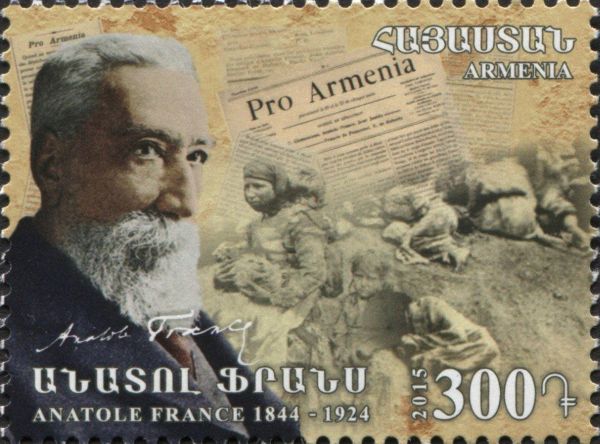 «Анатоль Франс последовательно выступал в защиту угнетенных народов, в частности армян Османской империи. Являлся инициатором и вдохновителем многих общественных мероприятий, имеющих своей целью ознакомить широкую общественность с обстановкой произвола, гонений и периодических избиений, постоянно царившей в Западной Армении. Во время массовой резни армян 1894-1896 Франс поднял голос протеста против султанских властей, заливших кровью исконную родину армян.